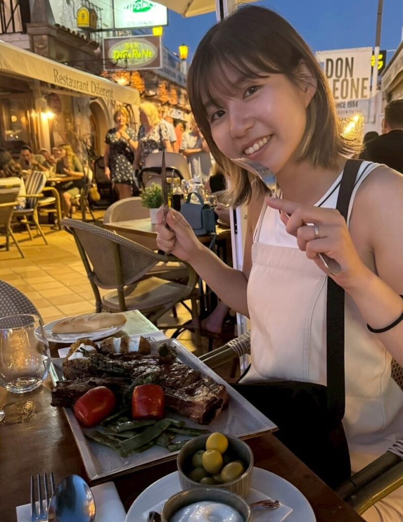 幸せを感じる瞬間:美味しいご飯を食べているとき、青空や太陽の光を感じるとき、夫とハグしているときに幸せを感じます。